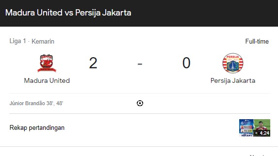 Tendangan keras penyerang Persija itu berhasil dihalau oleh penjaga gawang Madura United FC Wawan Hendrawan dan wasit yang memimpin pertandingan Ginanjar Rahman Latief langsung meniup peluit panjang sebagai tanda pertandingan berakhir.