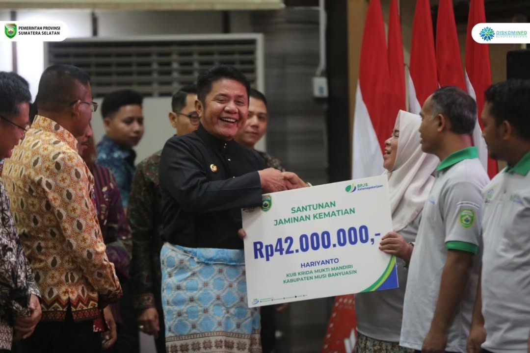 Palembang, Berita Rakyat Sumatera – Pemerintah Provinsi Sumsel bekerjasama dengan BPJS Ketenagakerjaan dalam rangka memberikan jaminan perlindungan bagi pekerja rentan petani sawit lakukan penyerahan secara simbolis santunan jaminanan kematian badan penyelenggara jaminan sosial ketenagakerjaan kepada petani / pekebun sawit di Sumatera Selatan tahun 2025. Penyerahan dilaksanakan di Graha Bina Praja. Kamis, 15/05/2025.