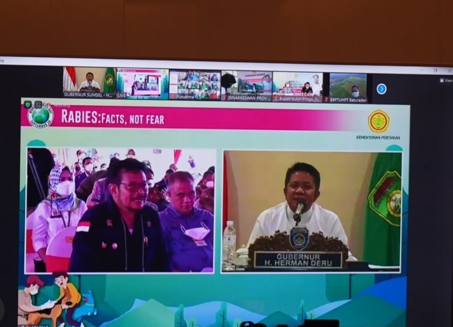 Palembang, Berita Rakyat Sumatera – Dalam rangka memperingati Hari Rabies sedunia (World Rabies Day/WRD), Gubernur Provinsi Sumsel H. Herman Deru Bersama Menteri Pertanian RI Syahrul Yasin Limpo, Direktur Jenderal Perternakan dan Kesehatan Hewan Kementerian Pertanian Dr. Ir. Nasrullah,M. Sc melangsungkan Dialog Interaktif secara virtual, bertempat di Hotel The Zuri Radial Palembang. Jum’at (8/10) Siang.