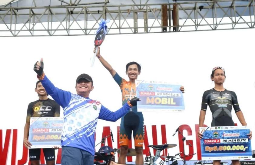 Palembang, Berita Rakyat Sumatera – Gubernur Sumatera Selatan H. Herman Deru memberikan hadiah 1 Unit Mobil kepada pemenang Juara 1 pada Event Sriwijaya Ranau Grand Fondo (SRGF) Kategori RB (Road Bike) Men Elite Ahmad Yoga pembalap asal Yogyakarta pada saat acara Closing Ceremony Sriwijaya Ranau Gran Fondo “Independence For Ride” 2023.