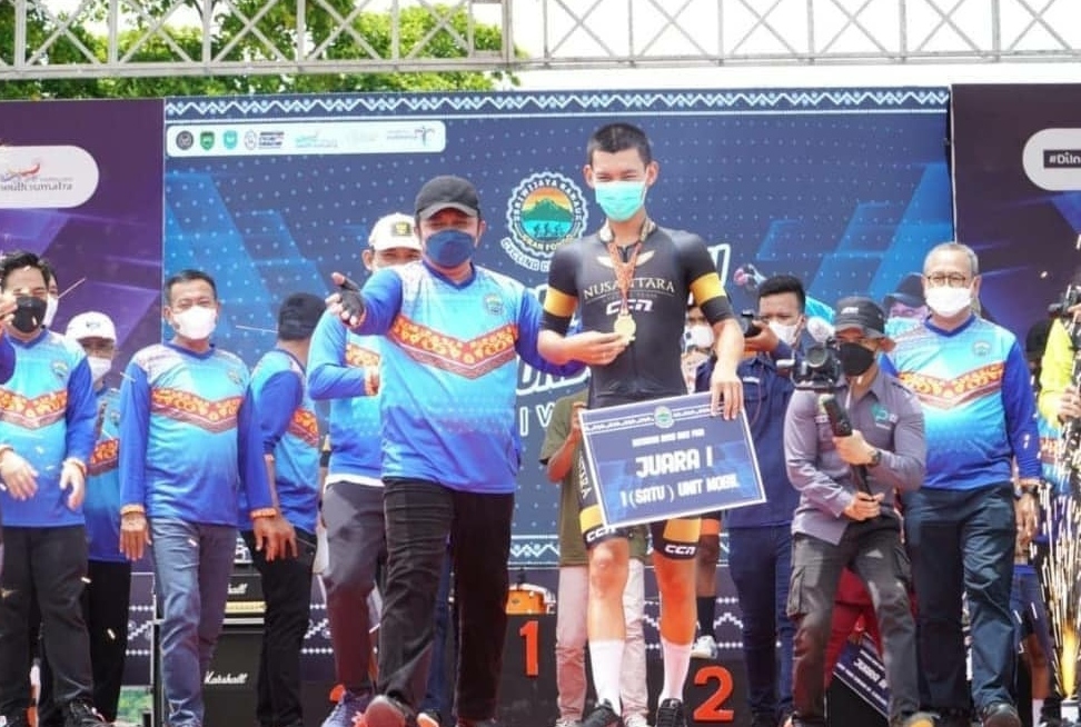 Oku Selatan, Berita Rakyat Sumatera – Setelah mengadu kecepatan bersepeda mengitari Danau Ranau sesuai ketentuan pelaksanaan Sriwijaya Ranau Gran Fondo (SRGF) Tahun 2021, Jodi Purnomo Setiawan goweser asal Jawa Timur berhasil meraih juara 1 (satu) Road Bike Pria.