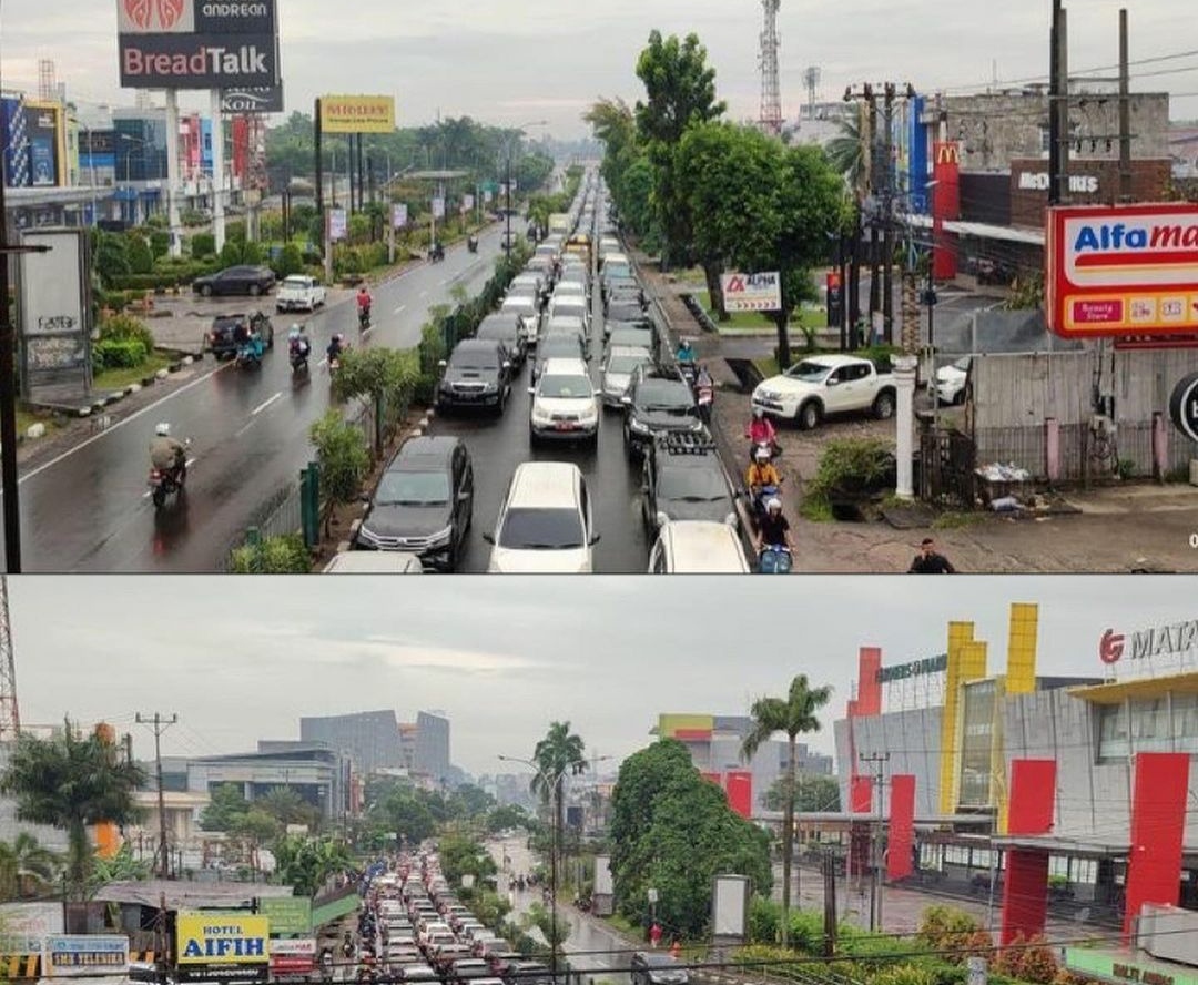 Kemacetan lalu lintas kendaraan antara lain terjadi mulai dari Jalan R Soekamto di depan PTC Mall dan Hotel Harper sampai ke Jalan Basuki Rahmat, Simpang Lampu Merah Angkatan 66.