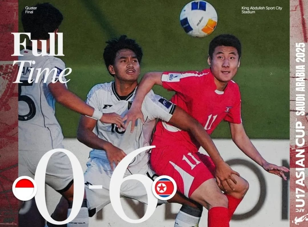 Jakarta, Berita Rakyat Sumatera – Timnas Indonesia U-17 harus mengakhiri kiprahnya dalam Piala Asia U-17 2025 setelah ditundukkan 0-6 oleh Korea Utara pada pertandingan perempat final Piala Asia U-17 2025 di Stadion King Abdullah Sport City Hall, Jeddah, Senin malam.